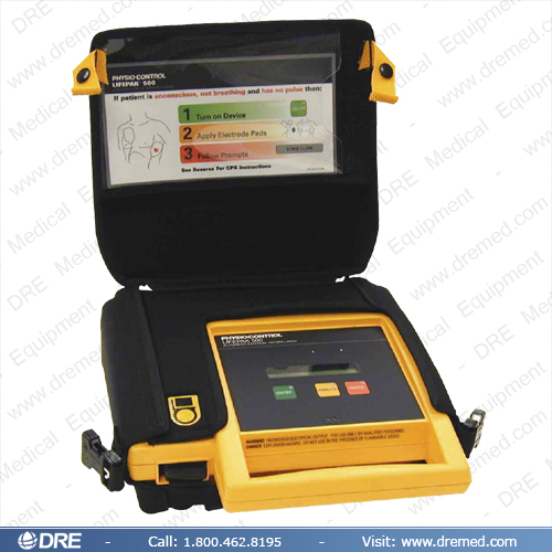 El Lifepak 500 AED, fábrica vendida reacondicionada del Physio-control de Medtronic, es diseñado para ser usado por primeros respondedores a emergencias cardíacas. El LP500 AED es ligero en 7 libras (3.2kg) y está disponible en modelos de biphasic o monophasic. Una batería de cinco años de litio significa que requieren ningún poder de corriente alterna. Los 2 simples o la operación de 3 botones toman a un usuario por el proceso de defibrillation con visual y de audio apunta. Secuencia de energía de salida: 200, 200, 360 o 200, 300, 360. Mostrado con transporte de caso.