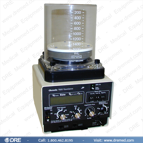 The Ohmeda 7800 Anesthesia Ventilator is available refurbished from DRE, Inc. This ventilator can be utilized on adult patients with a pediatric option. The 7800 is powered by AC with battery back-up. The liquid crystal display ensures a clear display screen. Functions are microprocessor controlled and there are audible and visual alarms. The vent provides Oxygen, Volume, and Airway Pressure monitoring.