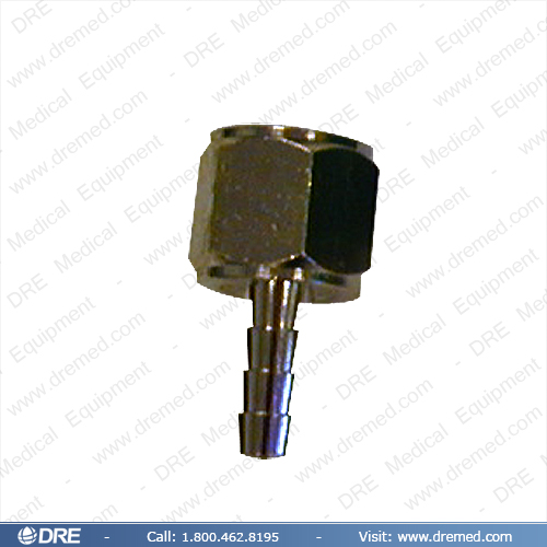 DRE offers Diss-style 1/4" male barb fittings for nitrous oxide (N2O) hoses. (Image shows Oxygen fitting)